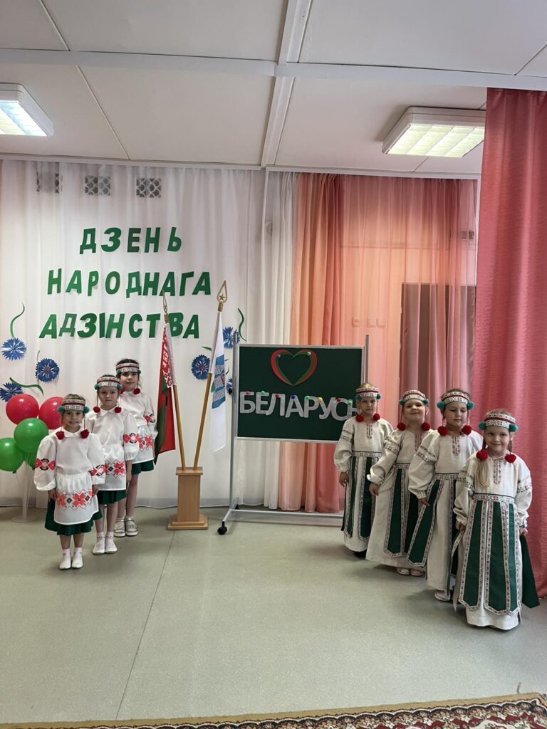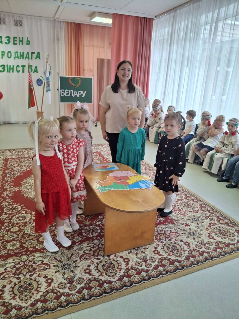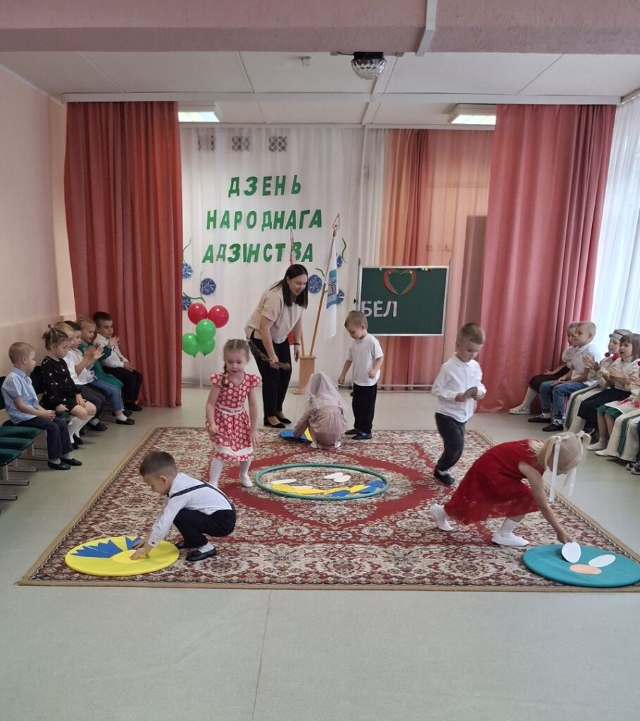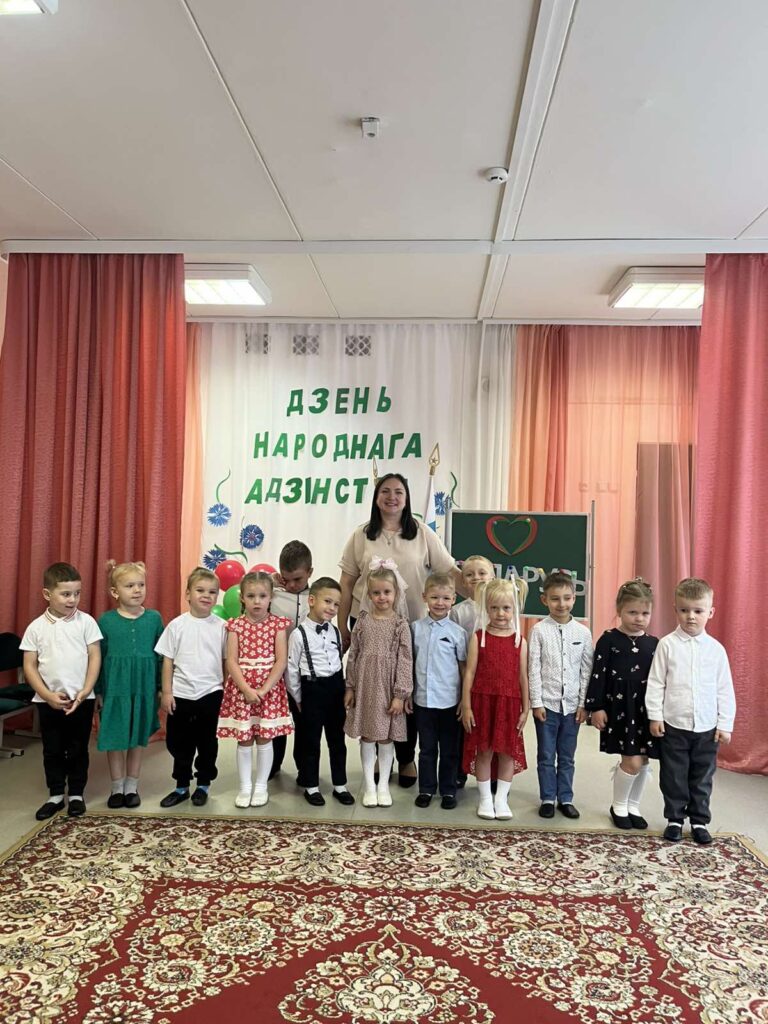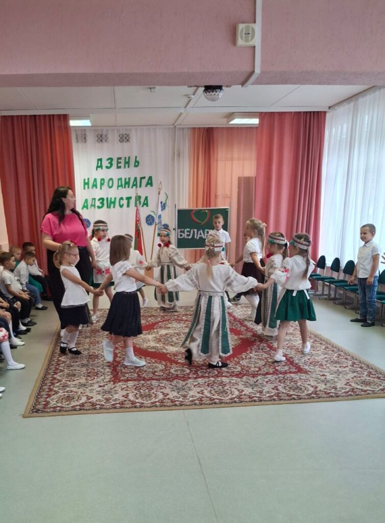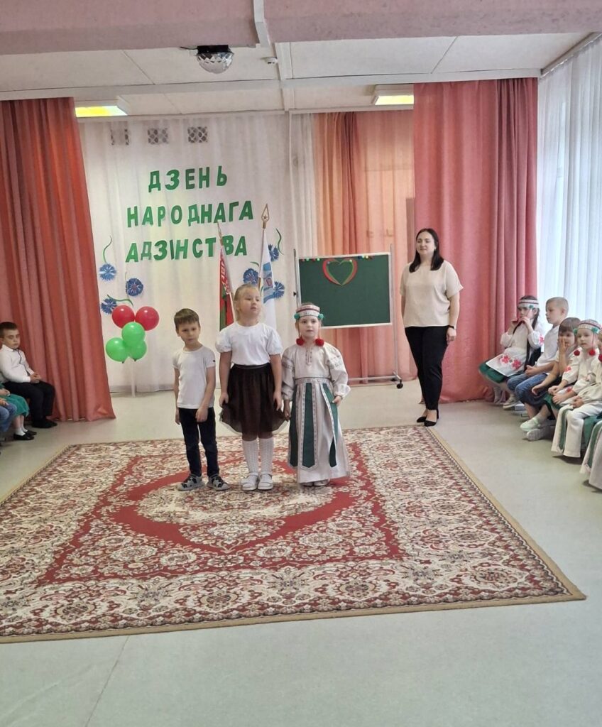 Традиционно в музыкальном зале прошло мероприятие гражданско-патриотической направленности «Мы вместе!» для старших воспитанников. Дети слушали и подпевали гимн Республики Беларусь, в доступной форме была проведена беседа о единстве белорусского народа. В игровой форме закрепили знания о символах нашего государства, расширили представления о карте Беларуси и её 6 областях. На протяжении всего праздника звучали стихи и песни о Родине, родном крае и дружбе. Ребята с удовольствием участвовали в конкурсах, где могли проявить свои таланты и командный дух.