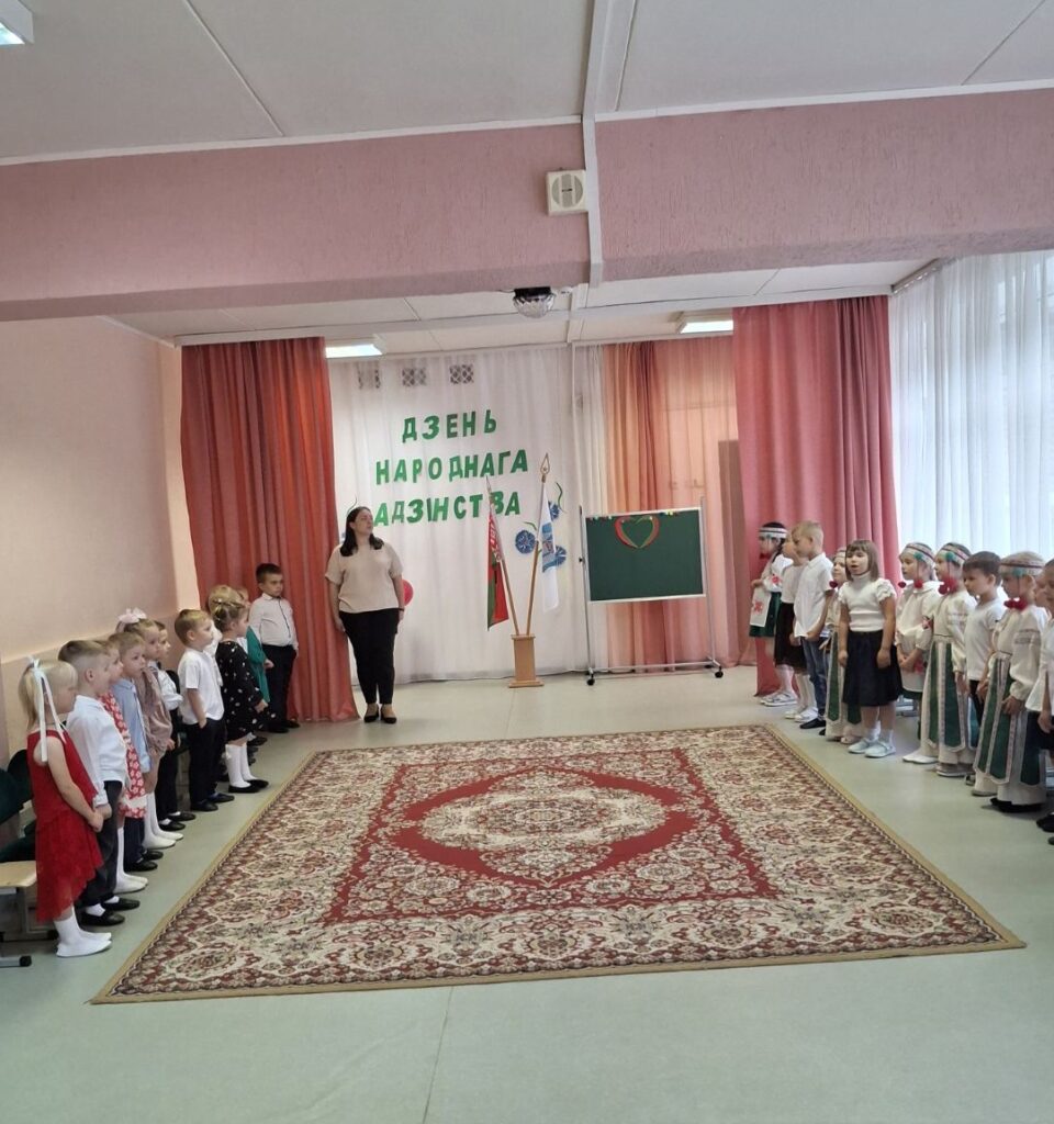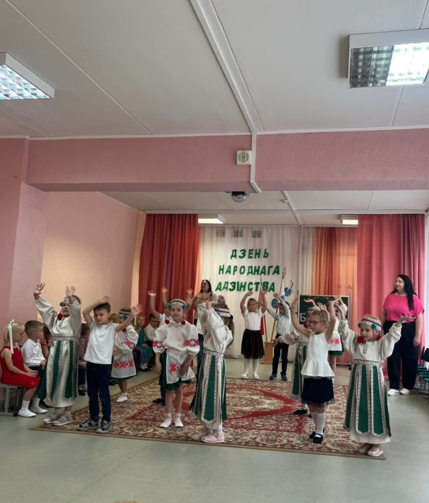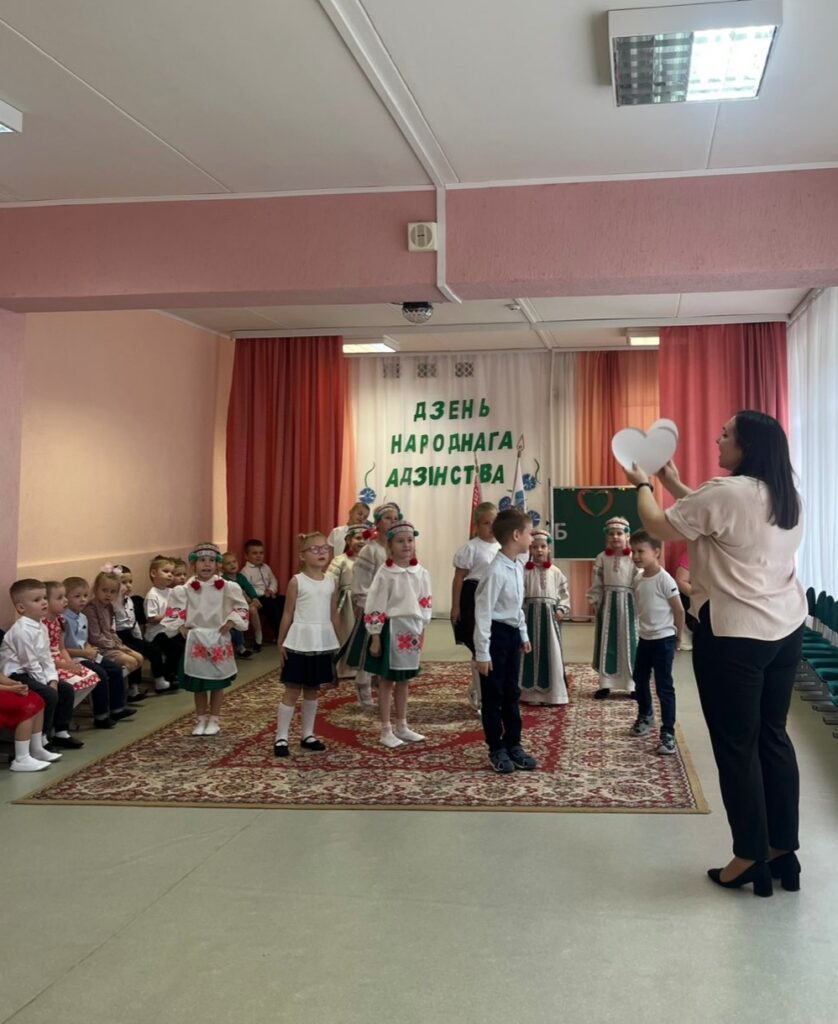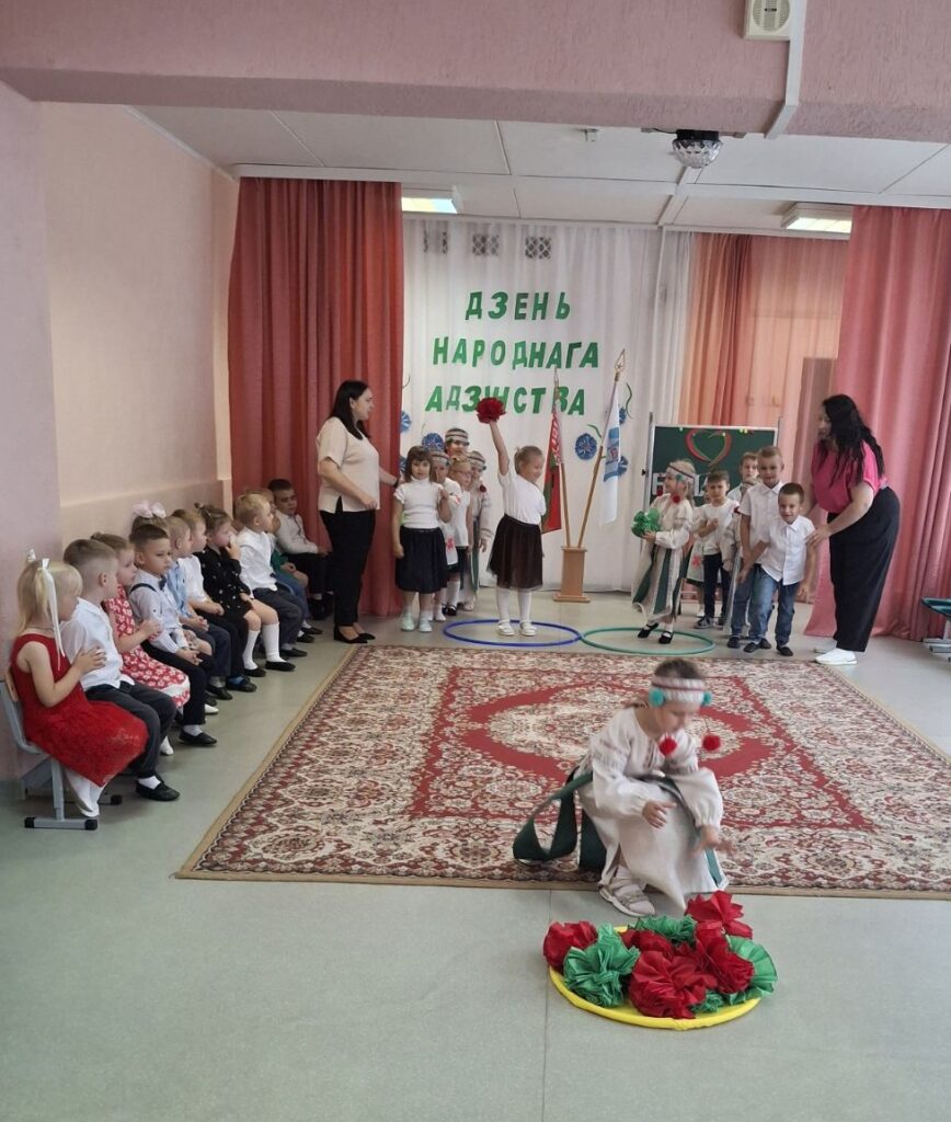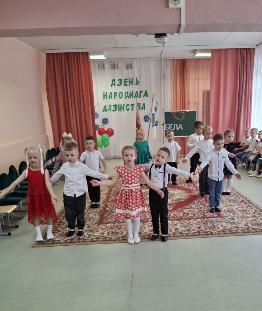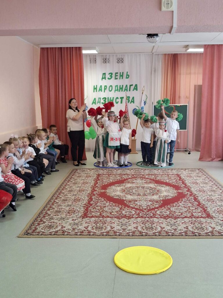 Традиционно в музыкальном зале прошло мероприятие гражданско-патриотической направленности «Мы вместе!» для старших воспитанников. Дети слушали и подпевали гимн Республики Беларусь, в доступной форме была проведена беседа о единстве белорусского народа. В игровой форме закрепили знания о символах нашего государства, расширили представления о карте Беларуси и её 6 областях. На протяжении всего праздника звучали стихи и песни о Родине, родном крае и дружбе. Ребята с удовольствием участвовали в конкурсах, где могли проявить свои таланты и командный дух.