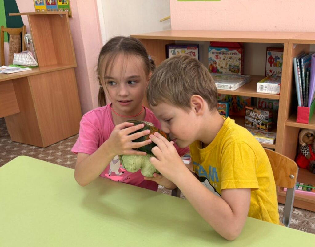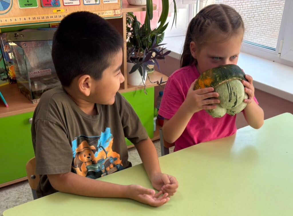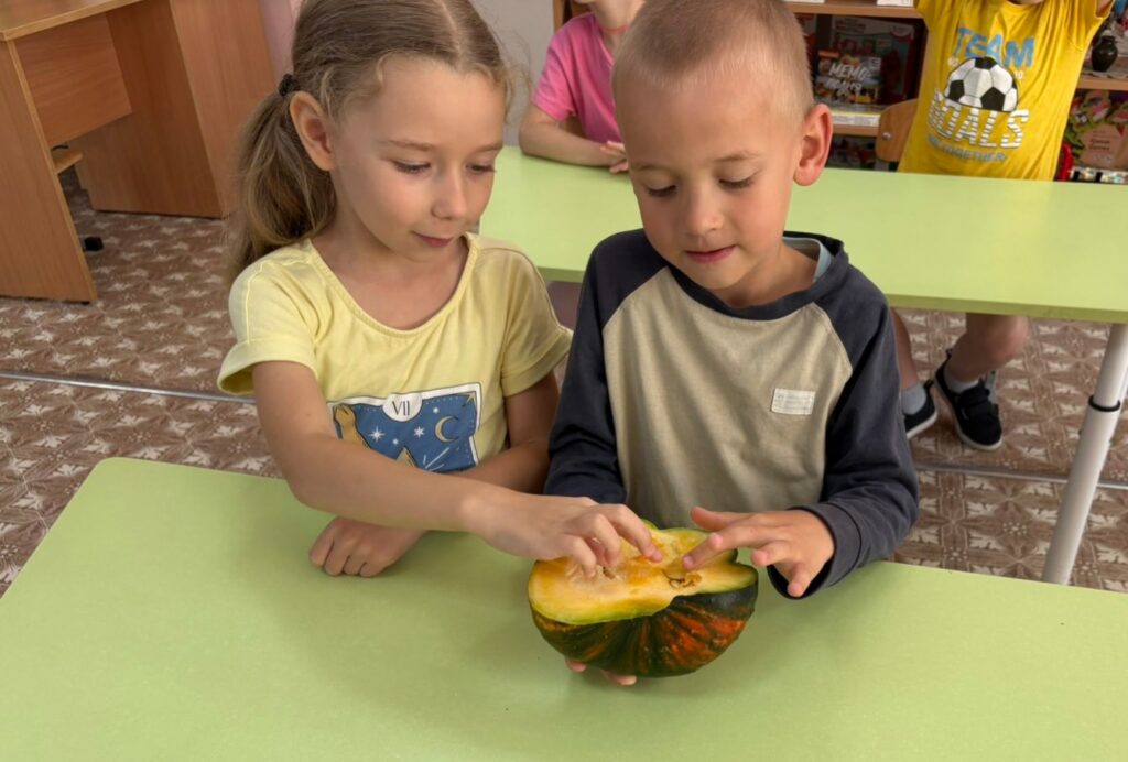 Сегодня ребята старшей группы № 1 с большим интересом рассматривали тыкву! Поговорили о том, как тыква растет на огороде, как ей нужен солнечный свет и вода, чтобы стать такой большой и красивой. Обсудили, что из тыквы можно приготовить много вкусных блюд: кашу, суп, пирог.