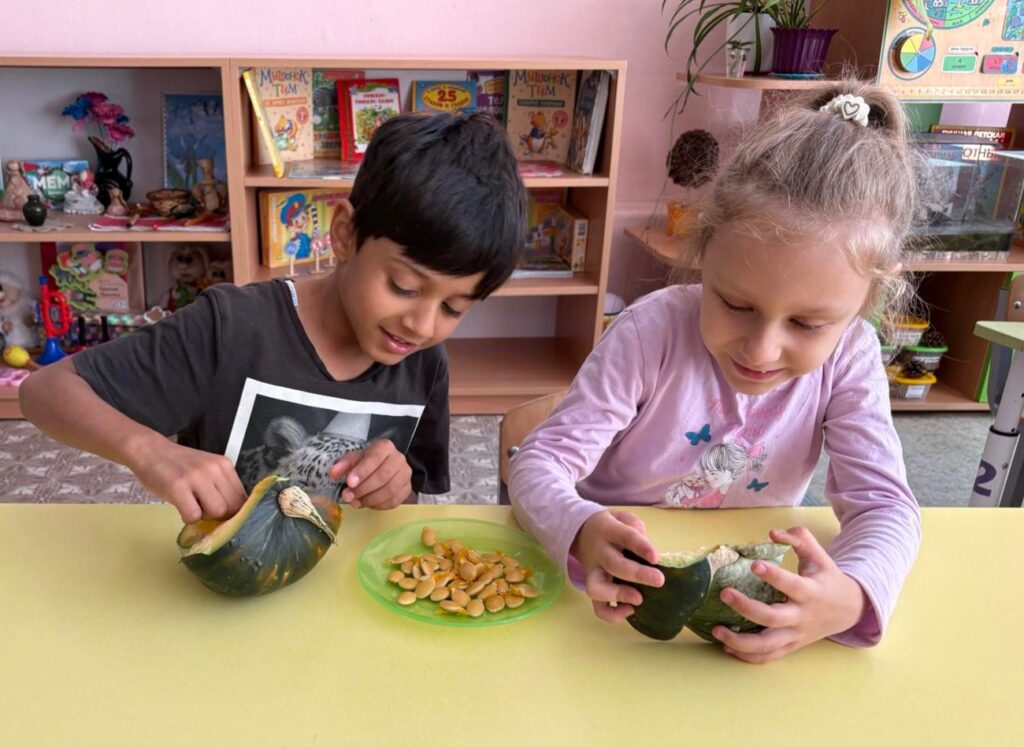 Дети были в восторге, когда трогали скользкие семечки и волокнистую мякоть, ощущая её особый запах. Ребята внимательно рассматривали настоящую тыкву, отмечая её особенности: где она более выпуклая, где есть небольшие вмятинки, как выглядит её хвостик. Это помогло им сделать рисунки яркой тыквы более живыми и узнаваемыми.