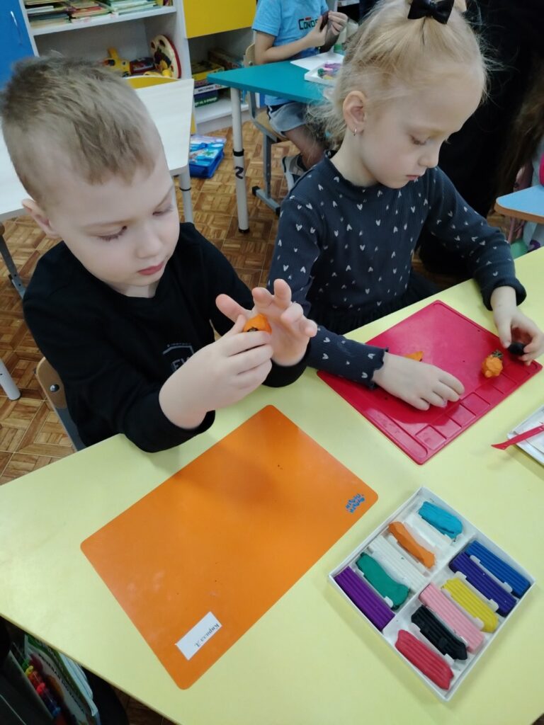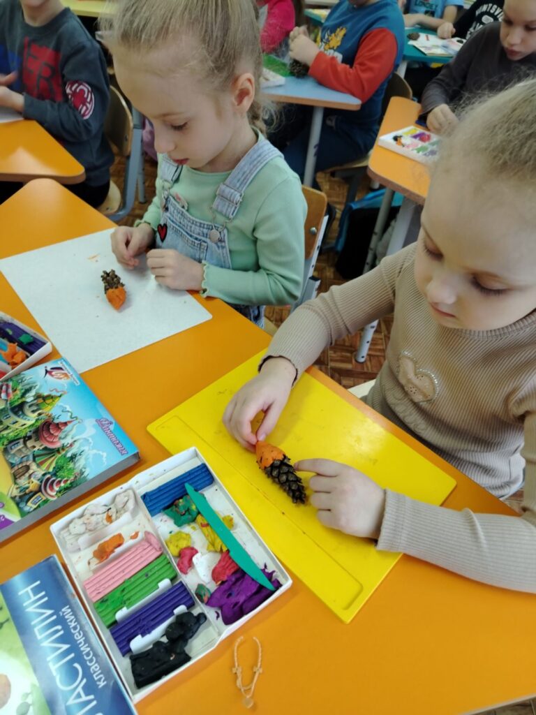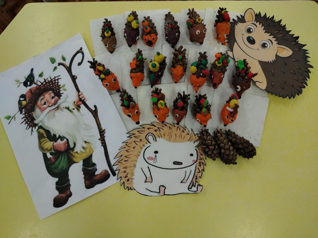 С большим интересом ребята создавали целостный образ ёжика из природного материала — шишек, дополняли образ пластилином. В процессе лепки развивали также творческие способности, образное мышление, чувство композиции, а также закрепляли умения и навыки работы с пластилином разными способами.