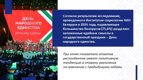 В суверенной Беларуси впервые идея учреждения Дня народного единства на самом высоком уровне прозвучала на шестом Всебелорусском народном собрании, которое прошло под лозунгом «Единство. Развитие. Независимость». Идея сплоченности общества, единства, стремление к миру и согласию близки всем людям, которые искренне любят Беларусь.
