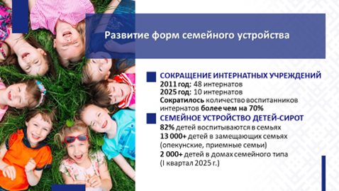 В целом за 2011–2025 гг. более чем в четыре раза сокращена сеть детских интернатных учреждений (с 48 в 2011 году до 10 – в текущем году). Количество воспитанников интернатов сократилось более чем на 70%.