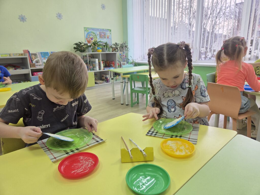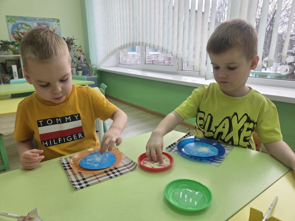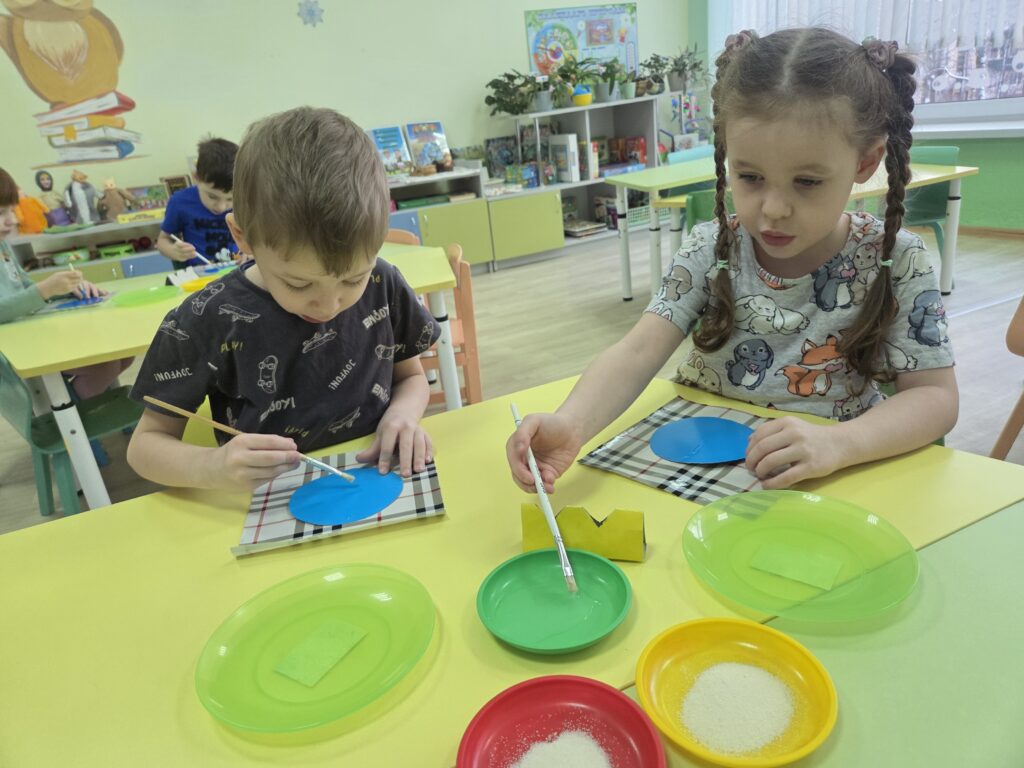 Дети с увлечением превращали обычную крупу в настоящие произведения искусства. Сначала каждый ребенок получил основу – плотный картон, на который затем наносился клейстер. А дальше начиналось самое интересное!
