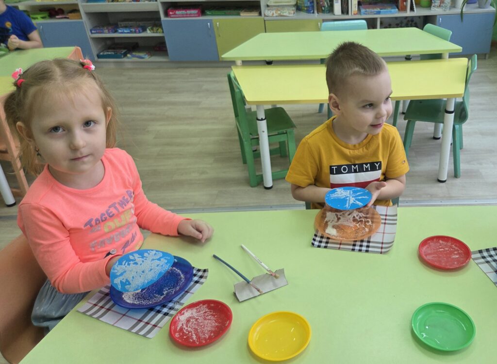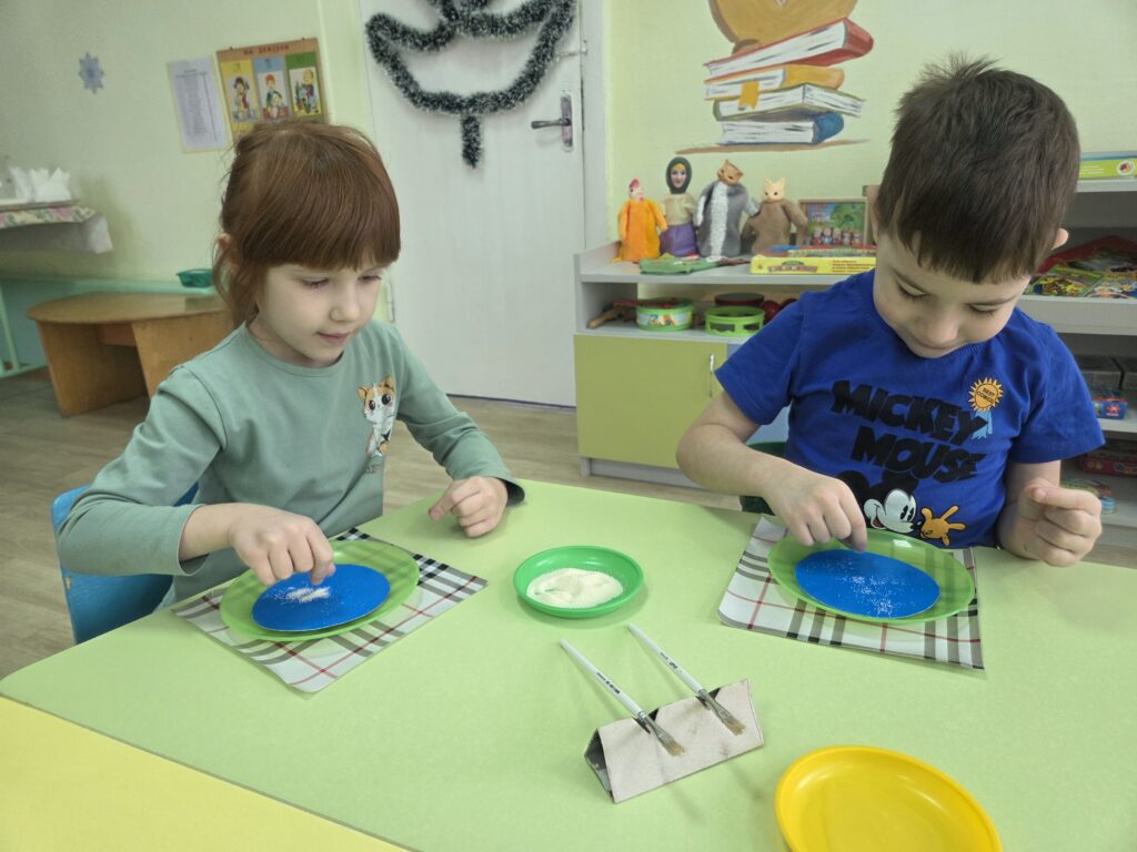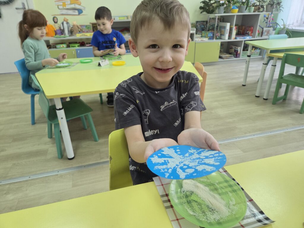В средней группе №1 сегодня царила настоящая зимняя сказка! Ребята с большим энтузиазмом взялись за создание снежинок из манки!