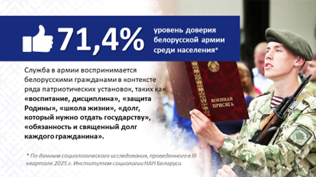 Отношение к Вооруженным Силам в белорусском обществе характеризуется стабильно высоким уровнем доверия на протяжении последних лет и составляет свыше 70%.