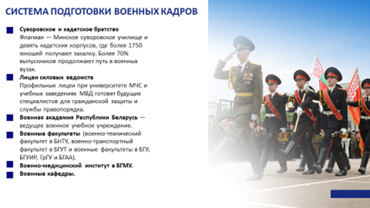 В Беларуси создана самодостаточная система подготовки военных кадров (от лейтенанта до генерала), интегрированная в структуру государственного образования. Она пользуется значительным авторитетом среди государств ближнего и дальнего зарубежья, о чем свидетельствует обучение в белорусских военных учебных заведениях военнослужащих дружественных государств.