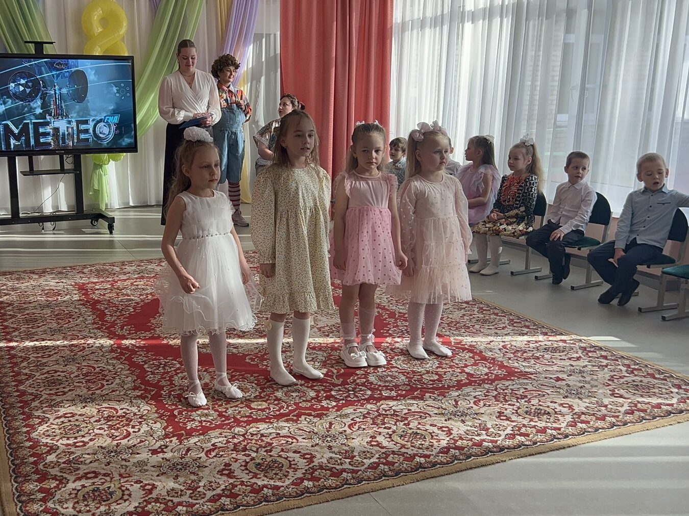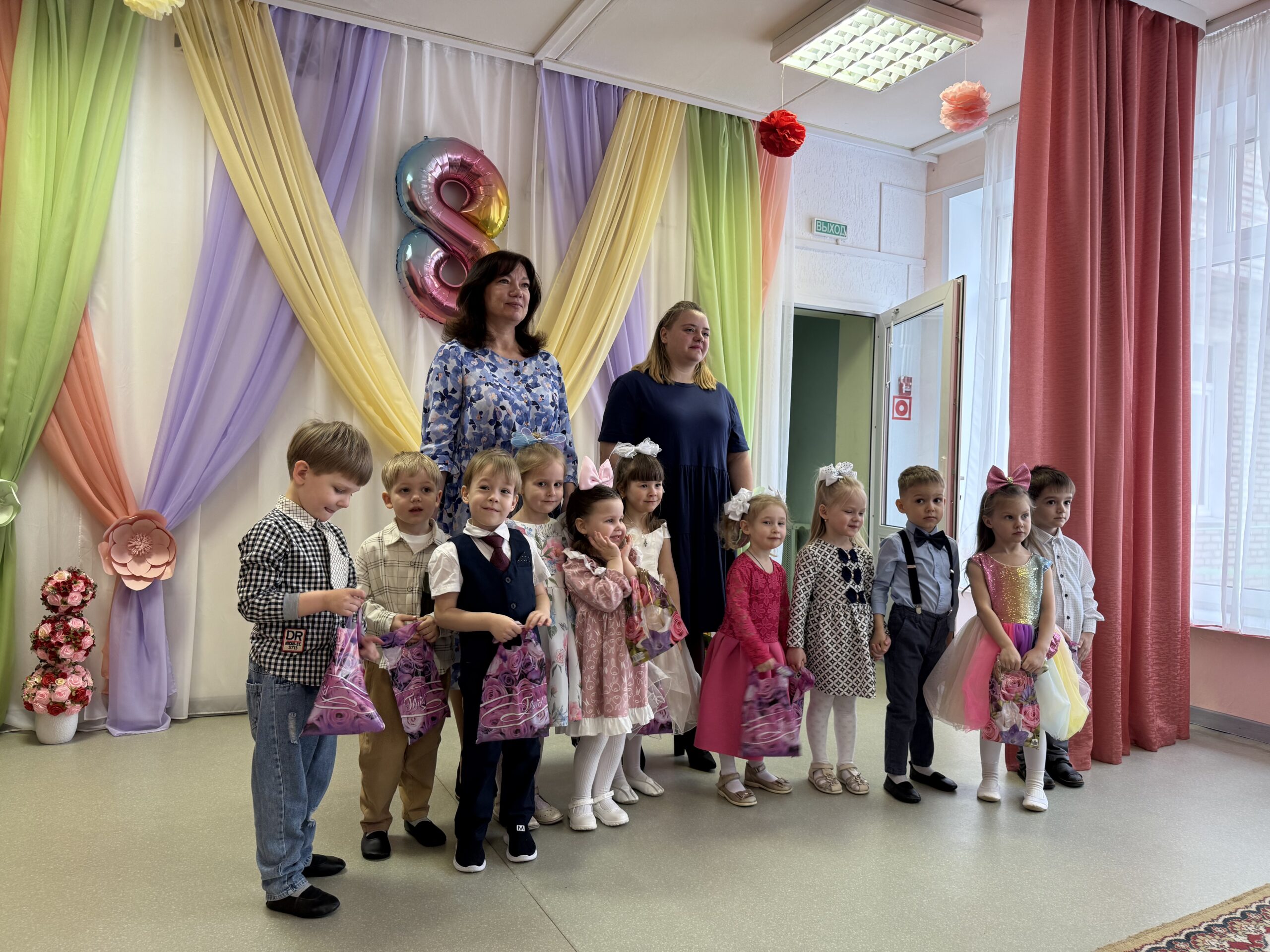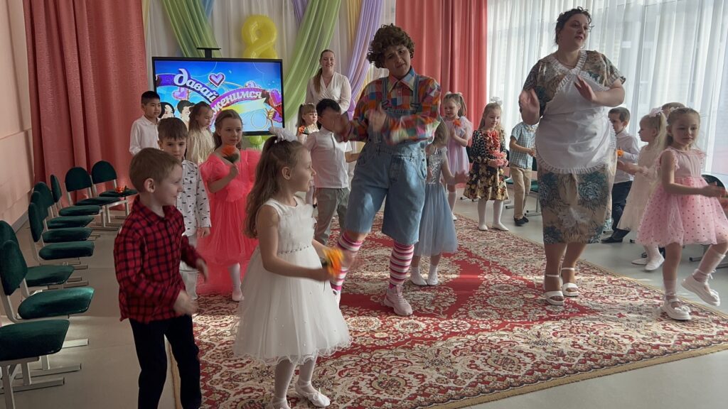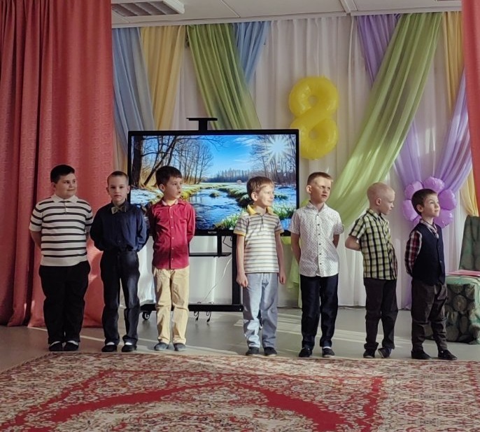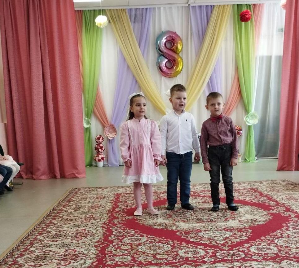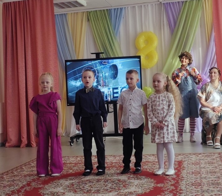 Воспитанники средней группы № 2 подготовили для мам и бабушек волшебные конфеты, в каждой из которых был спрятан музыкальный подарок — песня, танец, весёлая игра «Оркестр» с музыкальными инструментами. Особенно запомнилась детям Ревушка — персонаж, требующий помощи в музицировании. Ребята показали умение сопереживать, откликаться на просьбу, а также слаженно действовать в предлагаемой игровой ситуации. Воспитанники старших групп № 1 и № 3 вместе с проказником Карлсоном и строгой Фрекен Бок попробовали себя в роли настоящих артистов — участников актуальных телепередач («Добрый вечер!», «Смысл жизни», «Арсенал», «Метеогид», «Фактор BY», «Народный повар»). В рамках данных телепередач ребята исполнили для мам и бабушек песни и танцы, которые вызвали у зрителей незабываемые, яркие эмоции, а самим исполнителям подарили уверенность в собственном успехе.