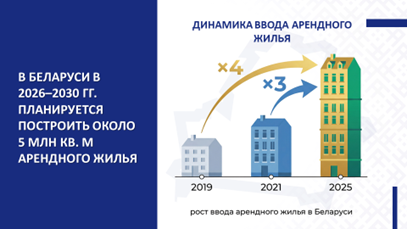Набирает темп строительство арендного жилья. На сегодняшний день арендное жилье – наиболее приемлемый способ решения жилищного вопроса. С одной стороны, оно позволяет повысить мобильность трудовых ресурсов и привлечь специалистов в малые и средние города Беларуси. С другой – закрепить молодых специалистов на первом рабочем месте. К слову, в Беларуси в 2026–2030 гг.