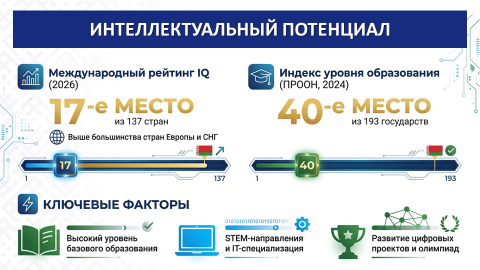 По данным International IQ Test 2026 года Беларусь вошла в двадцатку стран по уровню интеллекта и заняла 17‑е место в мировом рейтинге из 137 стран. Беларусь обошла большинство стран Европы и СНГ. Аналитики связывают это с традиционно высоким уровнем базового образования, широким охватом школьников естественно‑научными дисциплинами и растущим интересом молодежи к IT‑специальностям. В последние годы в стране активно развиваются STEM‑направления, инженерные олимпиады и цифровые образовательные проекты.