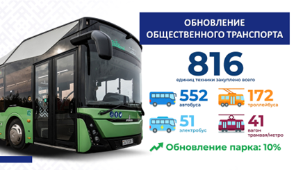 Развивается транспортное сообщение. Организациями транспорта общего пользования осуществляется обновление подвижного состава. Только в 2025 году во всех регионах республики закуплено 816 единиц городской пассажирской техники: 552 автобуса, 172 троллейбуса,