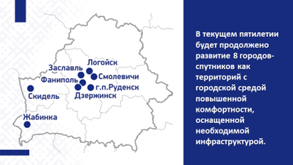 в Брестской (г.Жабинка), Гродненской (г.Скидель), Минской (города Дзержинск, Заславль, Логойск, Смолевичи, Фаниполь, г.п.Руденск) областях как территорий с городской средой повышенной комфортности, оснащенных необходимой инфраструктурой.