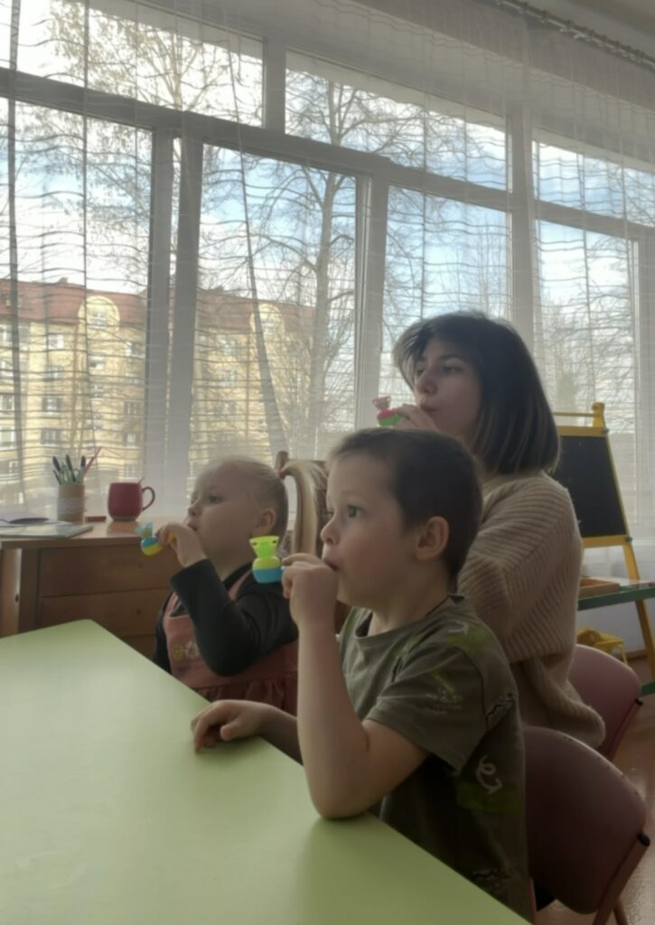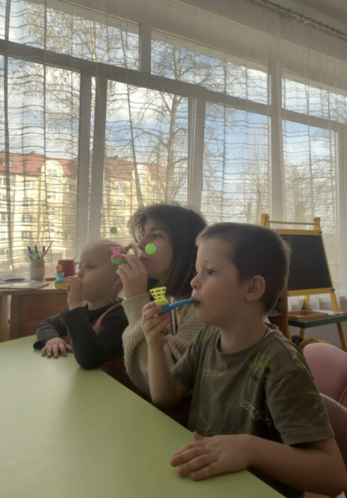Чтобы проверить, насколько хорошо у нас получается, мы устроили веселую игру: кто сможет дольше всех продержать мячик в воздухе, выдыхая на него! В данной игре мы с ребятами тренировались правильно вдыхать и выдыхать, чтобы мяч как можно дольше удерживался в воздухе. Получается это далеко не с первого раза, даже у взрослого человека, но мы очень старались.