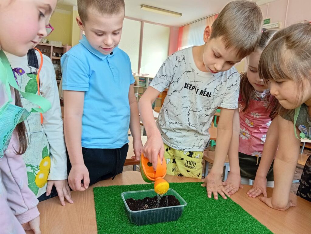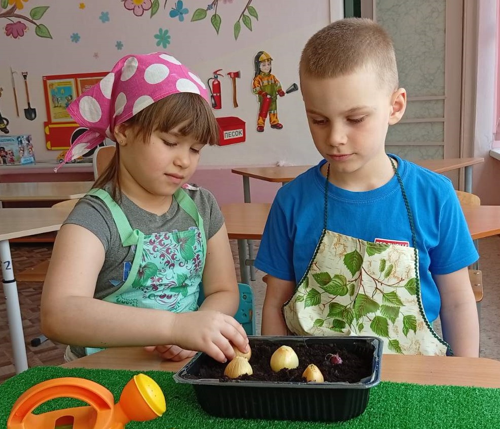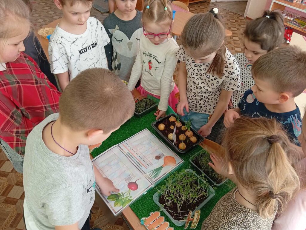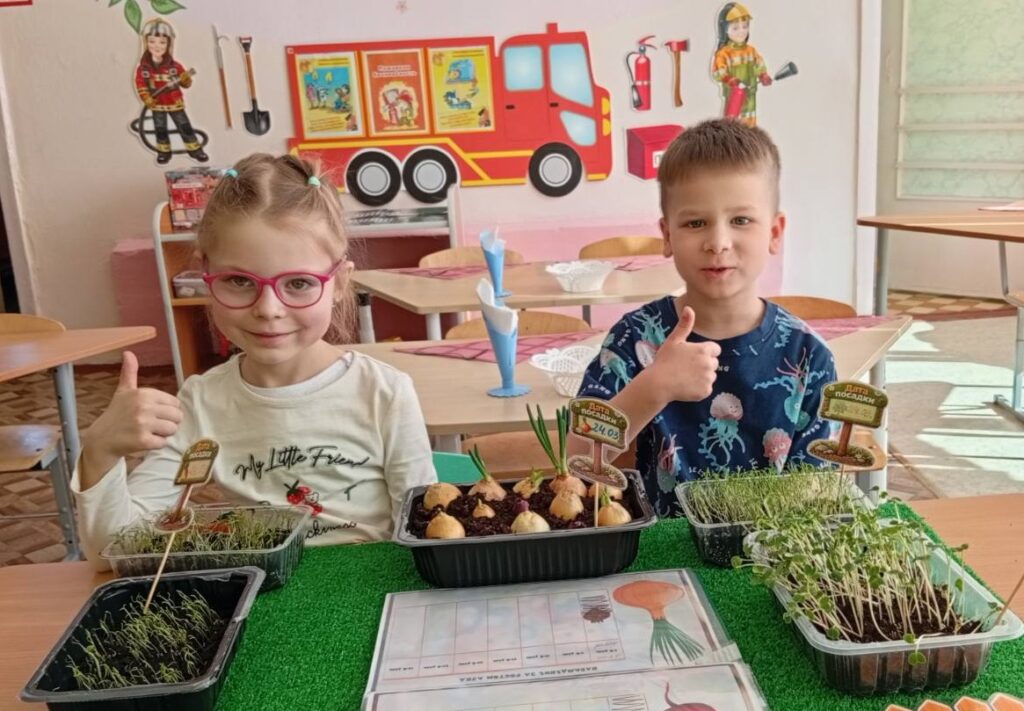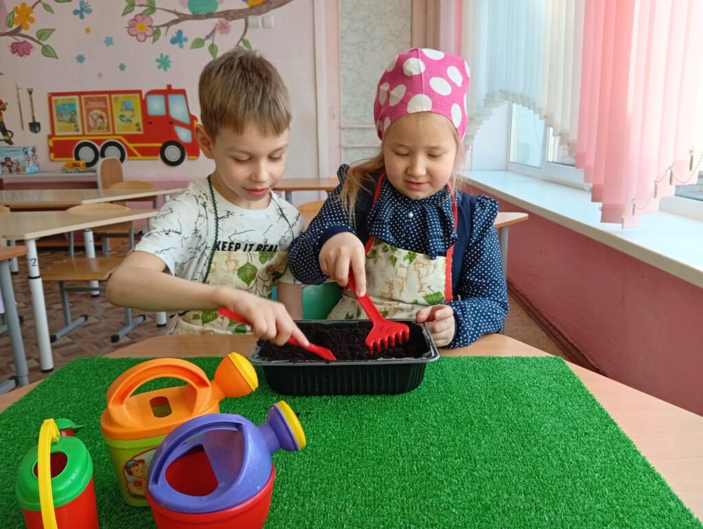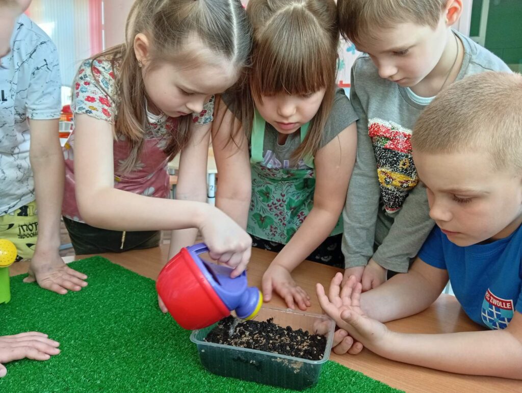 Ребята старшей группы № 2 сажали лук, семена укропа, петрушки, морковки и редиски. После посадки они аккуратно поливали землю и разместили контейнеры на самом светлом, южном окне.